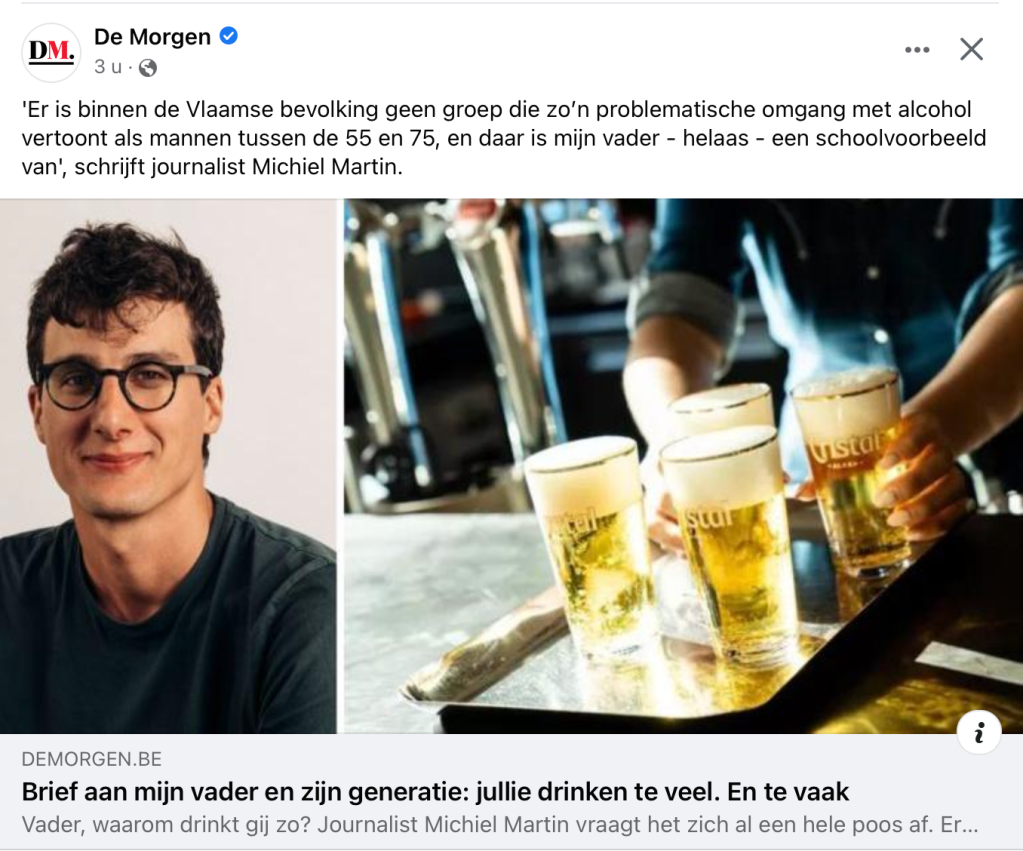 In een opiniestuk schrijft de jonge journalist een open brief aan zijn vader en bij uitbreiding aan een hele generatie mannen tussen de leeftijd van 55 en 75 dat hij/zij te veel alcohol drink(t)(en). Alleen al bij het lezen van de titel heb ik er genoeg van. Ik ben het beu dat snotneuzen zoals Michiel Martin schrijven wat mijn generatie moet doen of laten. Het past mooi in de themamaand Tournée Minérale, een uitvinding van de mainstream mediabedrijven. Dat de schrijvelaar op deze kar springt hoort gewoon bij zijn functiebeschrijving. En straks zal er weer een groep verketterd worden omdat ze in mei het gras maaien. Maai-niet-mei is een hersenspinsel van Knack Magazine dat ons wil laten geloven dat grassprietjes ook gevoelens hebben. Hoe zotter hoe beter! Bij de VRT loopt deze maand een campagne om de “zelfliefde” te promoten inclusief spotjes en programma’s op radio en TV. Maar opgelet, geen zelfbevlekking in november want dan is het No-Nut-November, net de periode dat we allemaal een pornosnor moeten laten groeien voor ‘Bro-vember’ en onze prostaat moeten laten onderzoeken. En in januari wordt er aan je gevraagd om een maand eens geen mening te hebben…